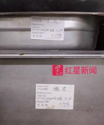 ▲2018年10月19日,学生家长在学校后厨内发现了标识生产于10月20日的猪皮等食材。 一位家长告诉红星新闻,幼儿园孩子的不锈钢碗,目测40%有洗洁精残留。同时,家长们还发现了提前泡发的木耳,“周一(22日)才使用,会有中毒隐患。” “食堂监管人员已被停职” 学校承诺改造厨房设备 在现场的家长们将发霉食材的照片传入家长群中,聊天群内,群情激愤。 据浦东新区市场监管局消息,19日当晚8时,接报后,即派人前往调查。 该局通报,现场检查时发现,中芯国际学校食堂蔬菜筐内的西红柿存在发霉现象,冰箱内存放的半成品加工日期标注为10月20日,厨房内部分调味品及半成品超过标注的保存期限。 22日,浦东新区市场监管局未披露更多信息,仍在调查中。 10月20日,有家长通过网络曝光此事,随即引发关注。 当日下午2时46分,中芯国际学校作出回应。 其中称,即日起,暂停上海怡乐食食品科技服务有限公司对学校食堂的供餐服务,并配合浦东新区教育局等相关政府部门,对其展开调查,依法依规追究其责任。 通报中,该校承诺,将启用新的餐饮供应商,确保10月22日正常供餐。经此事件,该校意识到,校方对供应商监管不力,并向家长及学生致歉。“食堂监管人员已被停职,接受调查。” 中芯国际学校一位工作人员告诉红星新闻,此事件,政府仍在调查中,不便发声。但该校承诺,将改造现有厨房设备,确保所有厨房加工环节透明化。 今日(10月22日)18时31分,上海怡乐食食品科技服务有限公司母公司康帕斯(中国)有限公司首次回应此事件。该公司在向红星新闻发来的邮件中称,这起事件引起社会关注,“我们对公众由此产生的担忧感到深深自责,并致以诚挚歉意……待本次调查完成后,将会及时公布详细调查结果。” 同时,该公司承诺,从10月21日起,安排第三方食品安全公司对项目点和供应商进行全面检查。“从周一(10月22日)起,我司按政府相关部门要求,停止上海市民办中芯学校食堂供餐。同时,根据学校、家长的要求,暂停对上海地区部分学校食堂的供餐服务……再次对全体员工进行食品安全培训。将以负责任的态度全力整改。” 校方更换供应商 家长: 我们可能太相信名牌了 周末过后,学生返校。 一位学生家长向红星新闻发来了校方的应急方案。 其中承认,10 月19 日,该校食堂发生了严重的食品安全隐患事件。“经学校董事会召开紧急会议讨论决定:在相关政府部门进行调查期间,停止餐饮服务商‘上海怡乐食食品科技服务有限公司’ 的一切供餐行动。” 过渡期内,中芯国际学校餐饮服务暂由中芯国际集成电路制造(上海)有限公司的现餐饮服务商上海优芙得餐饮管理有限公司提供,“自10 月22 日起,承接学校过渡时期的供餐,直至学校选出新的餐饮服务商。” 上海优芙得餐饮管理有限公司相关负责人向红星新闻证实,21日晚,该公司已派员入驻。 22日午餐后,一位家长向红星新闻发来了学校午餐的照片:清炖牛肉,西兰花炒肉片,素炒卷心菜,鱼香茄子……这与17日、18日及19日被连续曝出的午餐照片相比,丰盛了很多。