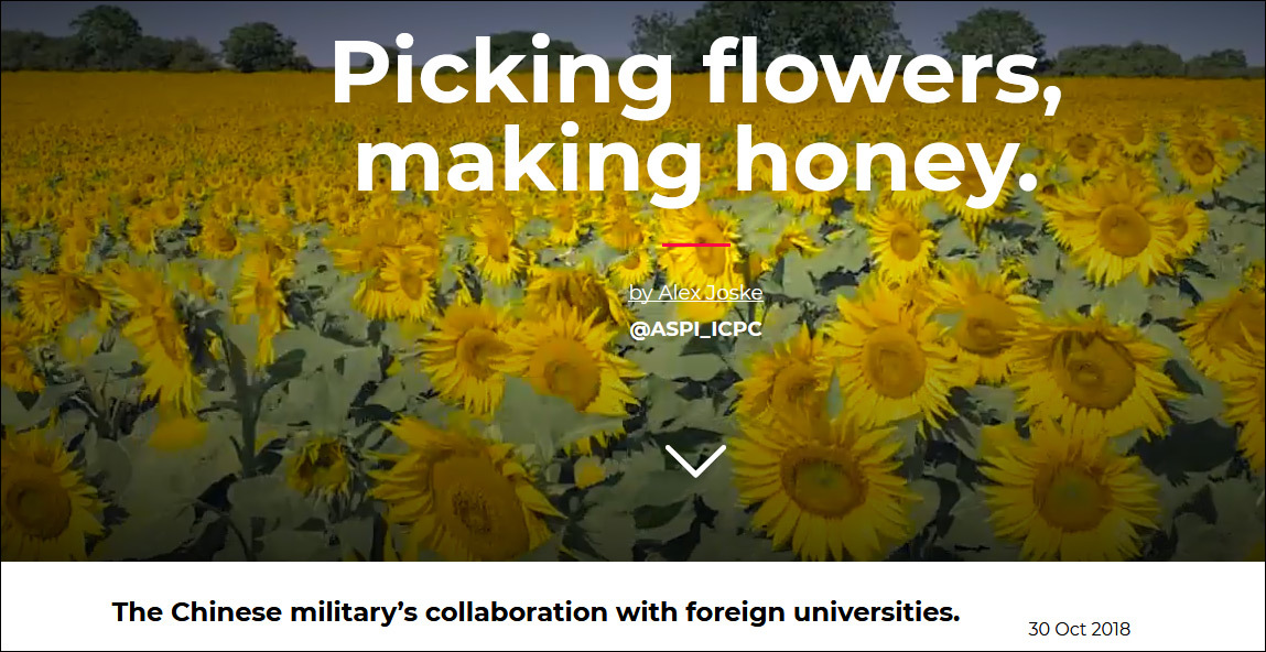 10月30日,澳大利亚战略政策研究所(Australian Strategic Policy Institute,简称ASPI)发表一篇题为“全球采花,中国酿蜜”的研究报告,称2007年以来,中国派遣了2500多名军方科学家和工程师前往美、英、澳等西方国家。他们其中一些人“故意隐藏军方背景”,借交流合作名义“攫取西方最新先进技术”, 建立起可以大大促进中国军事科技发展的研究合作网络。 ![]()