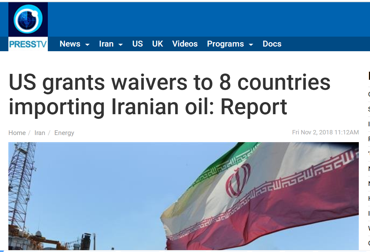press tv报道截图。 伊朗PressTV 刚刚援引伊朗伊斯兰共和国对外广播电视台(IRIB)消息称,伊朗石油部副部长Ali Kardor 针对美国全面恢复对伊朗制裁,但给予8国进口伊朗石油豁免一事表示,豁免表明市场需要伊朗石油,它不能被撤出市场。“我不知道这些豁免是永久的还是临时的。” 法新社此前消息称,美国国务卿蓬佩奥没有具体说明是哪8个国家获得豁免,只表示被豁免的都是承诺或已经减少进口伊朗石油的国家。 法新社称,外界猜测,被豁免国家必然包括印度、日本、韩国。