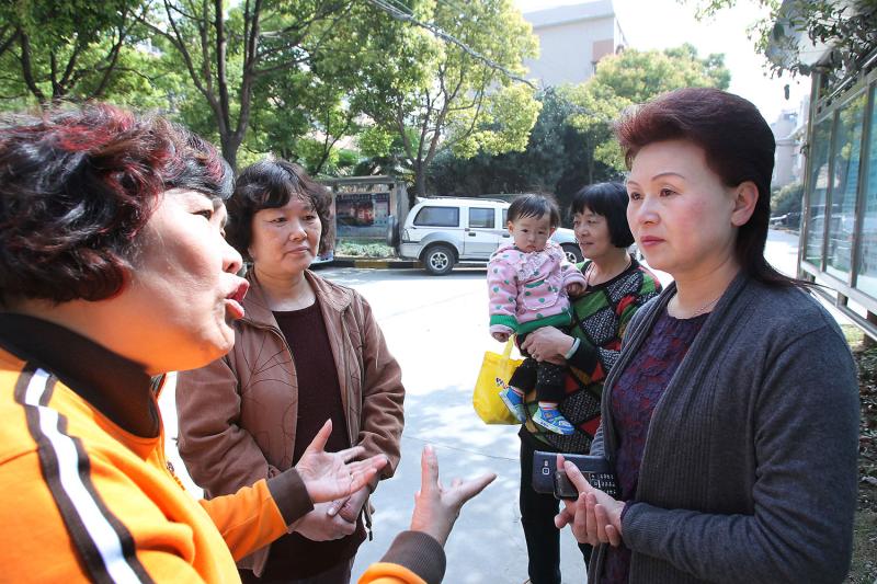 普陀区桃浦莲花公寓居民区书记梁惠丽听取居民反映漏水问题。蒋迪雯摄
