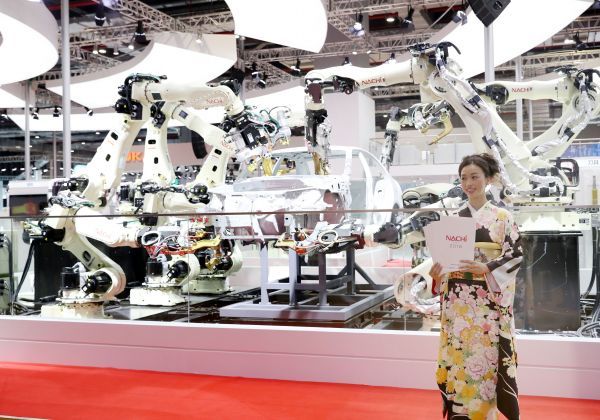 11月5日,一名那智不二越公司的工作人员站在用于汽车制造的焊接机器人展示台前。 新华社记者方喆 摄