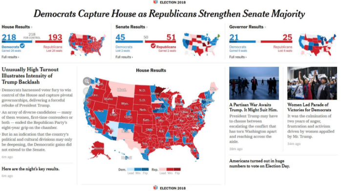 纽约时报截图 新华社华盛顿11月6日电(记者颜亮 孙丁)据美国多家媒体6日晚报道,民主党在当天举行的中期选举中夺回国会众议院控制权,共和党则进一步巩固了参议院多数党地位,美国国会将再度进入“分裂”时代。 美国有线电视新闻网、福克斯新闻台等媒体报道说,民主党获得的席位将超过众议院多数党所需的218席,时隔8年重新控制众议院;共和党在印第安纳、密苏里等州夺回国会参议院席位,进一步巩固了参议院多数党地位。新一届国会将于2019年初履职。 民调显示,医保、移民和经济是本次选举中最受关心的三大议题;近三分之二的选民表示,希望通过投票表达对总统特朗普的支持或反对。 特朗普6日深夜在社交媒体上说:“今晚取得巨大成功,感谢所有人!”现任众议院少数党领袖、民主党人佩洛西则表示,新一届国会将对白宫进行制衡。 美国布鲁金斯学会高级研究员达雷尔·韦斯特在接受新华社记者采访时表示,国会陷入“分裂”或将引发更多政治僵局。分析人士指出,民主党或凭借众议院多数党地位对特朗普政府内政外交事务进行更多牵制。 当天的中期选举还改选了36个州长、三处海外属地的行政长官和大部分州级立法机构等。(参与记者:徐剑梅、刘阳、胡友松)