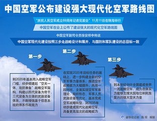 “庆祝人民空军成立69周年记者见面会”11日在广东珠海举行,中国空军在会上公布了建设强大的现代化空军路线图。 中国空军副司令员徐安祥中将说,中国空军现代化建设按照三步走战略设计和展开,与国防和军队建设的总目标一致。 第一步,到2020年基本跨入战略空军门槛,初步搭建起“空天一体、攻防兼备”战略空军架构,构建以四代装备为骨干、三代装备为主体的武器装备体系,不断增强基于信息系统的体系作战能力。 第二步,在实现2020年目标任务的基础上,进一步构建全新的空军军事力量体系,推进空军战略能力大幅提升;再用一段时间,全面实现空军军事理论、组织形态、军事人员、武器装备现代化,基本完成空军战略转型,到2035年初步建成现代化战略空军,具备更高层次的战略能力。 第三步,到本世纪中叶全面建成世界一流战略空军,成为总体实力能够支撑大国地位和民族复兴的强大空天力量。 另据空军装备部综合计划局局长王中华当日在中国航展上表示,改革开放40年,中国空军经历二次创业,装备建设取得历史性成就,发生历史性变革。当前空军武器装备发展建设的阶段特征,可概括为两个跨代和两次质变。 两个跨代,即主战装备跨代,基于网络信息系统的体系建设跨代,空中进攻、防空反导、战略预警、空中投送、空降作战等核心能力持续提升,海上和高原作战能力进一步加强。 关于两次质变,王中华表示,一个是已经和正在发生的质变,空军经历了量变积累期,战略能力、体系作战能力和联合作战能力显著增强,基本形成了以三代、四代装备为骨干,轻重搭配的装备体系格局。另一个是正在孕育新的质变,建设全新面貌的空军,构建面向未来的空天力量体系。