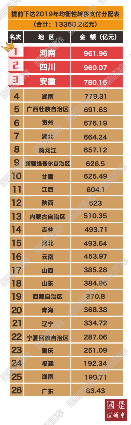 双十一你剁手,“财爸”撒起钱来也不含糊。 日前,财政部连续下发了6个通知,提前向全国地方政府投入16632亿元(人民币,下同)的中央财政资金。 这笔钱主要包含两部分,一部分是提前发放的均衡性转移支付资金,总额高达13350.2亿元;另一部分是包含中央对地方资源枯竭城市转移支付资金在内的五类资金,总额为3281.8亿元。 然而,财爸的各类红包并非人人有份。撒钱比例最大的均衡性转移支付资金中,北京、上海、天津、浙江、深圳和江苏均没有被列入划拨名单,相比之下,河南却被分到962亿元,成为收获均衡性转移支付财政红包的最大“锦鲤”。 财爸如此分钱,有何打算?提前下发1.66万亿资金,原因何在? 河南、四川收获最多 根据财政部下发的通知,13350.2亿元的均衡性转移支付资金将被分配给26个省份。国是直通车通过梳理发现,资金主要集中在中西部和东北地区,人口大省河南收获961.96亿元位居榜首,四川以960.07亿元紧随其后,安徽和湖南则以780.15亿元以及779.31亿元位居第三和第四。 获得资金最少的是广东省,收获83.43亿元,仅为河南省的百分之九。