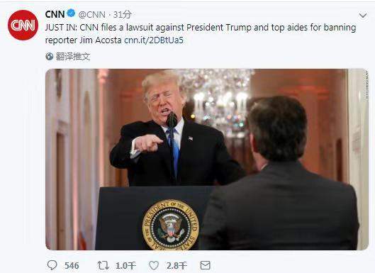 【快讯!CNN把特朗普告了!】CNN发言人刚刚证实,该媒体已在华盛顿特区当地法院起诉美国总统特朗普及其几位助手,指控他们禁止CNN记者阿科斯塔出席白宫记者会的禁令违反美国宪法第一和第五修正案。