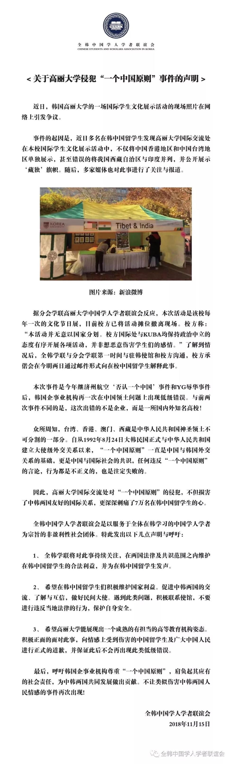 邮件截图 这封邮件题为《高丽大学国际服务中心致中国学生们》。但据高丽大学中国学联负责人透露, 只有来自中国大陆的学生收到了上述邮件,港台学生没有收到。 环环16日也看到了邮件内容,并全文翻译如下: 您好!这里是国际服务中心。 关于昨天在民主广场举行的“International Student Festival ”活动发生的事情在此向中国学生进行说明。 高丽大学通过与全世界名校进行交换生交流,很多交换学生来到高丽大学。KUBA是帮助交换学生的社团,同时也是向外国大学交换学生提供生活帮助的学生团体,KUBA为了给在高丽大学的交换学生带来好的体验而组织各种各样的活动。 其中的一个活动便是“International Student Festival ”,在这个活动中,很多交换学生理解彼此出生地的文化、饮食、民族服装,还可以品尝地球村各地食物。 关于展位,在有限的空间内不能给所有申请者分配展位,KUBA的运营团队经过审查后,给展示具有特色的、有差异的内容的学生们按地域分配了展位。正如各位顾虑的一样,展位没有以国家或者领土为标准进行分配。属于某一个国家,但是服装或者饮食有特色的地区,也会另外分配展位,此外,提交的方案很好,但是在人数较少的情况下,也会分配与其他地区合并展位。 举例来说,上个学期,美国和夏威夷的展位是分别设置的,这个学期,英国和爱尔兰分配了同一个展位,德国和奥地利也分配了共同的展位。因为“International Student Festival ”不是以国家为单位宣传自己政治、外交及相关事宜的场所,而是文化交流的场所。 活动设立的展位中有西藏&印度展位。单纯是分享西藏和印度食物的场地。 参加这个展位的学生们是因为要穿着自己地区的服装和制作自己地区的食物并不是某种政治性的活动。 但是结果是,中国固有领土西藏被单独分出来,给看到这个展位的中国学生们心里带来伤害。本活动单纯是想要给参加的学生提供更加多样的文化体验,没考虑到这给中国学生竟然带来伤害。 中国和韩国自1992年建交以后,在政治、经济、文化上进行各种各样的交流,建立了良好的情谊。高丽大学国际服务中心尊重这样的两国间的睦邻友好关系和“一个中国”政策。 同时,反对“International Student Festival ”活动被用于政治。 国际服务中心在今后的国际活动中,将尽最大努力,以符合原来的宗旨开展活动,同时将努力使得包括中国学生在内的参加的学生都能以愉快的心情享受。 再次对心里受到伤害的学生表示抱歉。 以上就是说明邮件全文。 如此致歉,你怎么看? 反正有中国学生说,这信读着不像是道歉。 番外 事不过三!全韩中国学人学者联谊会谴责高丽大学侵犯“一中原则” 14日,韩国高丽大学首尔校区举办国际学生文化展示活动,因其将“西藏与印度并列”展出,且出现“藏独”旗帜,在中国微博上引发争议。15日,全韩中国学人学者联谊会官方微信发表声明,谴责高丽大学侵犯“一个中国原则”,并联系到此前发生的济州航空否认“一个中国”事件和YG辱华事件,批评韩国知名高校继韩国企业之后又一次在中国领土问题上出现低级错误。 以下是全韩中国学人学者联合会声明全文: