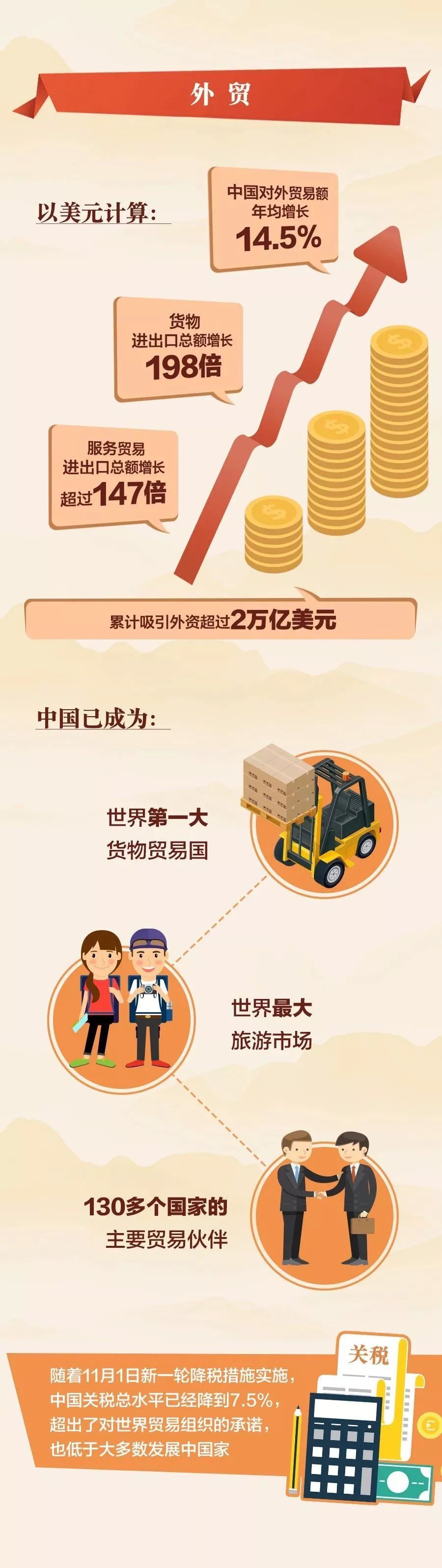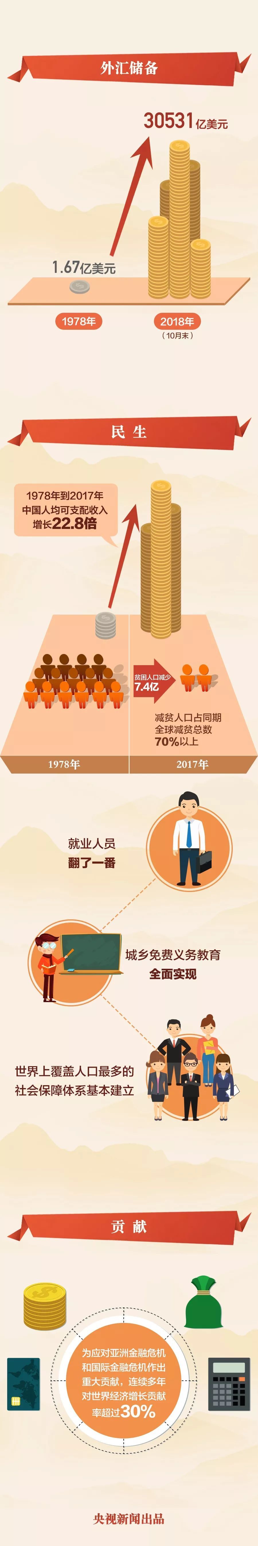 ![]() 11月13日,习近平在参观“伟大的变革——庆祝改革开放40周年大型展览”时强调,改革开放40年来,在中国共产党坚强领导下,中国人民艰苦奋斗、顽强拼搏,用双手书写了国家和民族发展的壮丽史诗,中华大地发生了感天动地的伟大变革。 18日,在巴布亚新几内亚举行的亚太经合组织工商领导人峰会上,习近平说,中国的今天,是中国人民干出来的!对于40年的改革开放历程,习近平用下面这些词来形容中国人民的努力: ![]() 今天,中国已经成为世界第二大经济体、第一大工业国、第一大货物贸易国。用一张图了解改革开放40年间中国的变化,感受那些令人振奋的数字↓↓ ![]() ![]() ![]() (责编:日升) (责任编辑:日升) |