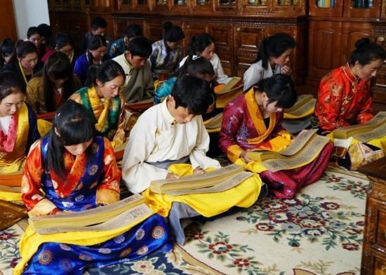 西藏藏医学院的学生正在研读记载着藏医药浴法相关知识的《四部医典》。刘罡 摄