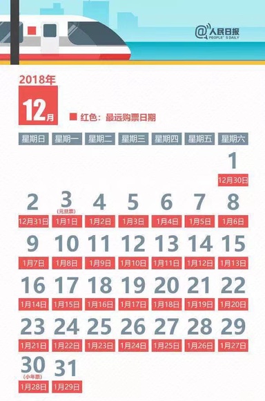 2019年元旦假期为2018年12月30日至2019年1月1日 2019年的脚步越来越近了。东方网记者今天从铁路部门获悉,元旦有出行计划的旅客已可购买2019年元旦小长假的火车票。 2019年元旦假期为2018年12月30日至2019年1月1日。按照全国铁路网络和电话订票预售期为30天的规定,有出行计划的旅客即日起可通过12306网站、12306手机客户端或拨打95105105订票电话购买元旦小长假的火车票。此外,代售点和自动售票机延后2天开卖,预售期为28天,旅客可于今日(12月3日)到现场购票。此外,购买元旦当天返程票的旅客,也可于今日通过网络和电话等购票。 需要注意的是,不同车站火车票的开售时间不同。例如,上海站起售时间为14点30分;上海南站起售时间为15点30分;上海虹桥站起售时间为13点30分。因此,旅客在购票前需查询好相应站点的售票时间,以免耽误购票出行。