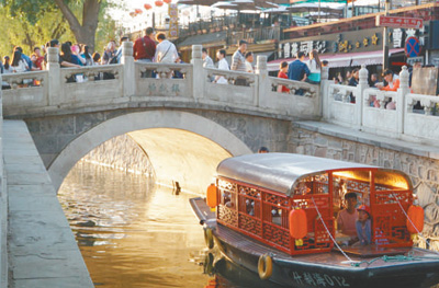 北京什刹海有个银锭桥(图④,资料图片),据说建于明代。上个世纪80年代、90年代,曾两次翻修。银锭桥是前海与后海的“分水岭”。桥长不足9米,宽7米,高只有4米,是个袖珍桥。桥虽然很小,但名堂不少。它是重要交通通道。钟鼓楼、北海公园、恭王府、烟袋斜街、大运河码头……就在周边。桥小人气旺,全国各地乃至世界各地慕名而来的游人络绎不绝。还有当地居民接送孩子上下学的电动车,商贩的三轮货车……从早到晚,熙熙攘攘,热闹非凡。可以说,银锭桥是北京最繁忙的古桥之一(图⑤)。