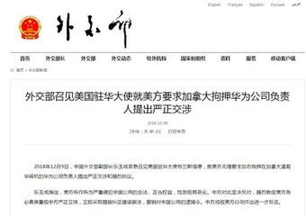 外交部网站12月9日消息,12月9日,中国外交部副部长乐玉成紧急召见美国驻华大使布兰斯塔德,就美方无理要求加方拘押在加拿大温哥华转机的华为公司负责人提出严正交涉和强烈抗议。