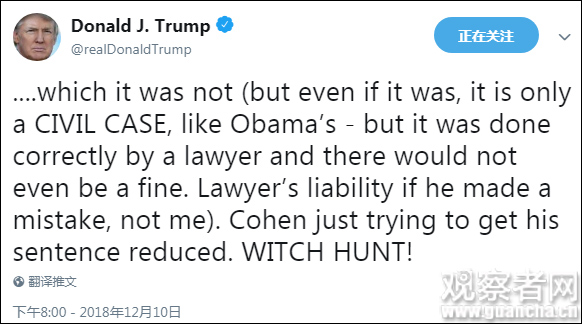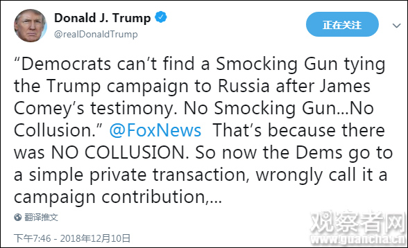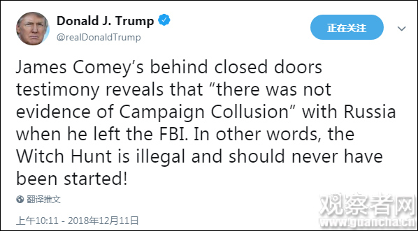 在否认“通俄门”时,他再次提到了“非法的政治迫害”。