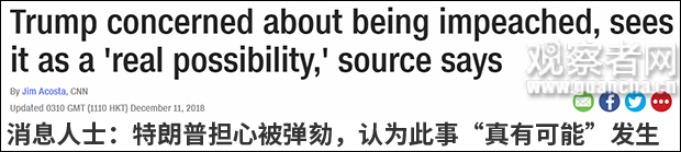 报道截图 “真有可能!”一向与特朗普不和的CNN独家爆料称,随着美国总统或遭弹劾的讨论日渐升温,就连特朗普自己也担心起来。 据美国有线电视新闻网(CNN)12月11日报道,10日,一名与总统关系密切的消息人士向CNN透露,特朗普已经开始担心,自己可能在民主党人接管众议院后遭到弹劾,他认为此事“真有可能(real possibility)”出现。 不过,该消息人士又补充称,特朗普也不确定这是否会发生。 另一名接近白宫的知情者则向CNN表示,白宫西翼的助手们认为,弹劾中“唯一可能死盯的话题(the only issue that may stick)”就是竞选资金的违规行为,这就涉及特朗普前律师迈克尔·科恩(Michael Cohen)被指向特朗普疑似情妇支付“封口费”一事。 据报道,在纽约南区检察官递交了一份轰动一时的文件后,关于弹劾的讨论在近日不断升温。在那份文件中,检察官首次直接指控科恩在2016年大选期间的违法行为是受到了特朗普指使。 民主党人则表示,特朗普犯了足以弹劾的罪行,他结束白宫任期后可能会进监狱。 上周日(9日),即将上任众议院司法委员会主席一职的民主党众议员杰里·纳德勒(Jerry Nadler)称,这些指控如果得以证实,就将构成“足以弹劾的罪行(impeachable offenses)”。