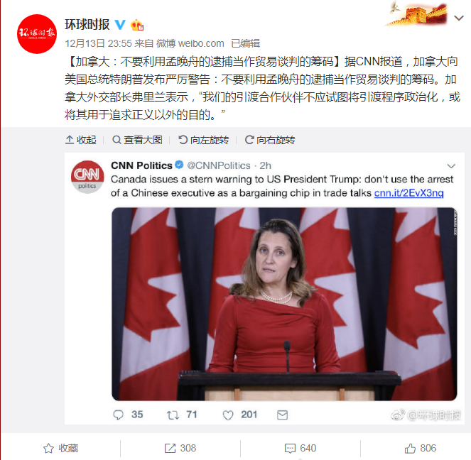 【加拿大:不要利用孟晚舟的逮捕当作贸易谈判的筹码】据CNN报道,加拿大向美国总统特朗普发布严厉警告:不要利用孟晚舟的逮捕当作贸易谈判的筹码。加拿大外交部长弗里兰表示,“我们的引渡合作伙伴不应试图将引渡程序政治化,或将其用于追求正义以外的目的。” 责编:北风 ![]() |