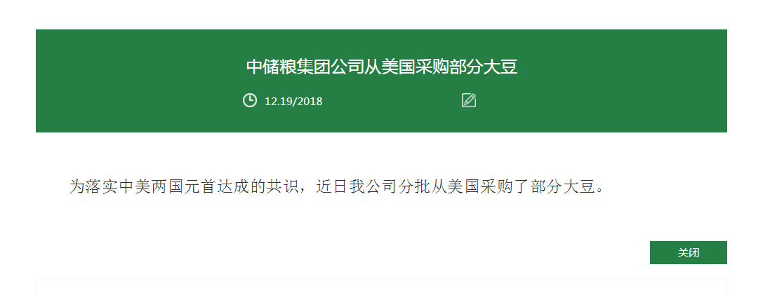 中储粮官网截图 早前报道: 中国已重启进口美国大豆?商务部:尚无消息通报 商务部网站12月13日消息,2018年12月13日商务部召开例行新闻发布会。 问:在近期路透社对美国总统特朗普进行的专访中,特朗普总统称,他认为中国马上会把从美国进口的汽车关税下调到15%,在中美之间尚未对贸易问题达成协议之前,美方不会对中国产品加征新关税。商务部能否证实美国总统的说法,或者有何评论?第二,据我们美国同事的报道,中国已经开始购买美国大豆,请问中国是否打算继续购买特朗普总统所说的巨大数量的大豆? 高峰:关于你提到的第一个问题,农产品、能源、汽车等是中美双方已达成共识的具体事项。具体细节将陆续公布。