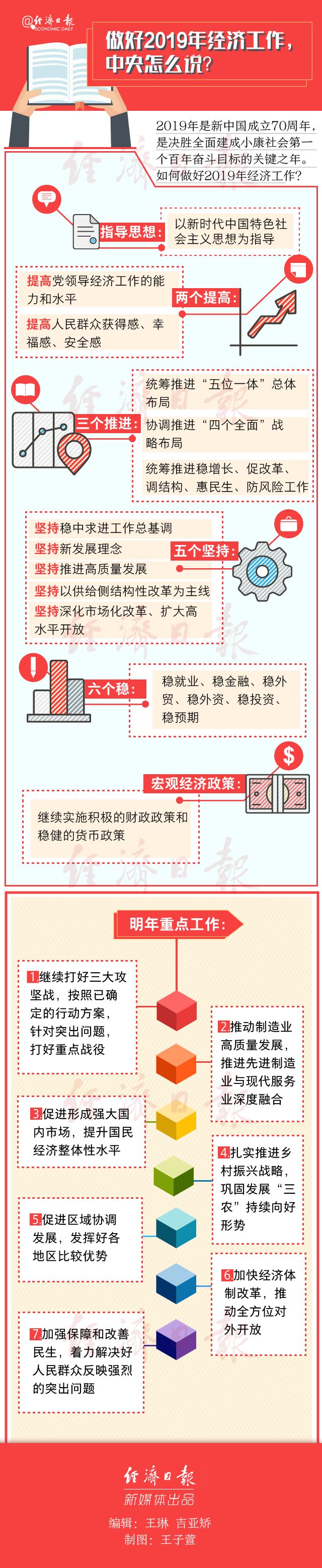 2019年是新中国成立70周年,是决胜全面建成小康社会第一个百年奋斗目标的关键之年。2019年经济工作重点将围绕哪些方面展开,成各界关注焦点。 2018年12月13日,习近平主持召开中共中央政治局会议,分析研究2019年经济工作。12月11日,习近平主持召开中共中央党外人士座谈会,就今年经济形势和明年经济工作听取各民主党派中央、全国工商联负责人和无党派人士代表的意见和建议。这两个会议已透露很多信息。 2019年经济工作怎么干?看图↓