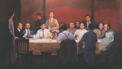 《曙光——中国共产党成立(上海)》石奇人绘作品以艺术笔法定格中国共产党在上海召开第一次全国代表大会的重要历史时刻。作者根据史料,如实再现了当时十几位创始人召开会议时环绕长桌而坐的场景。