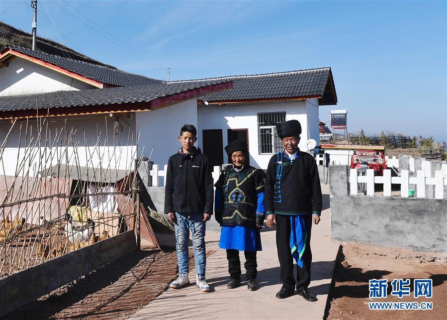 这是四川凉山彝族自治州昭觉县解放乡火普村村民吉地尔子(右)一家在新家前合影(2018年2月11日摄)。新华社记者 刘坤 摄