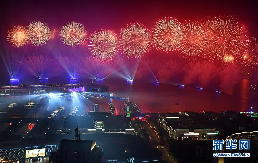 这是青岛举行的《有朋自远方来》灯光焰火艺术表演(2018年6月9日摄)。新华社记者 李紫恒 摄