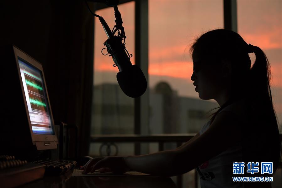 盲女杨虹在江西省泰和县融媒体中心播音间练习播音(2018年9月25日摄)。新华社记者 彭昭之 摄