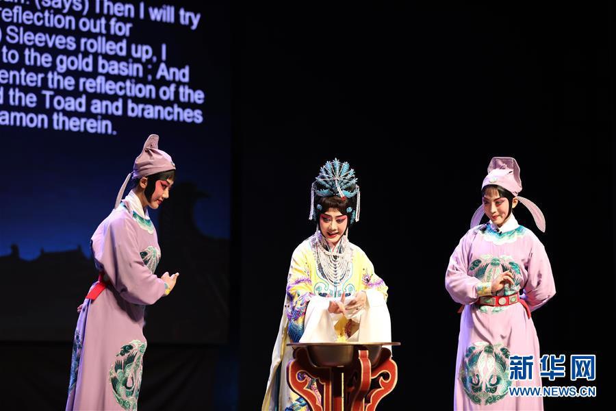 在约旦河西岸城市拉姆安拉,中国国家京剧院演员为当地观众表演《长生殿》选段(2018年9月19日摄)。新华社记者 赵悦 摄