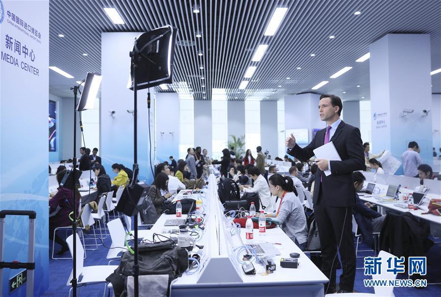 在上海举办的首届中国国际进口博览会的新闻中心,中外媒体记者在工作(2018年11月5日摄)。新华社记者 兰红光 摄