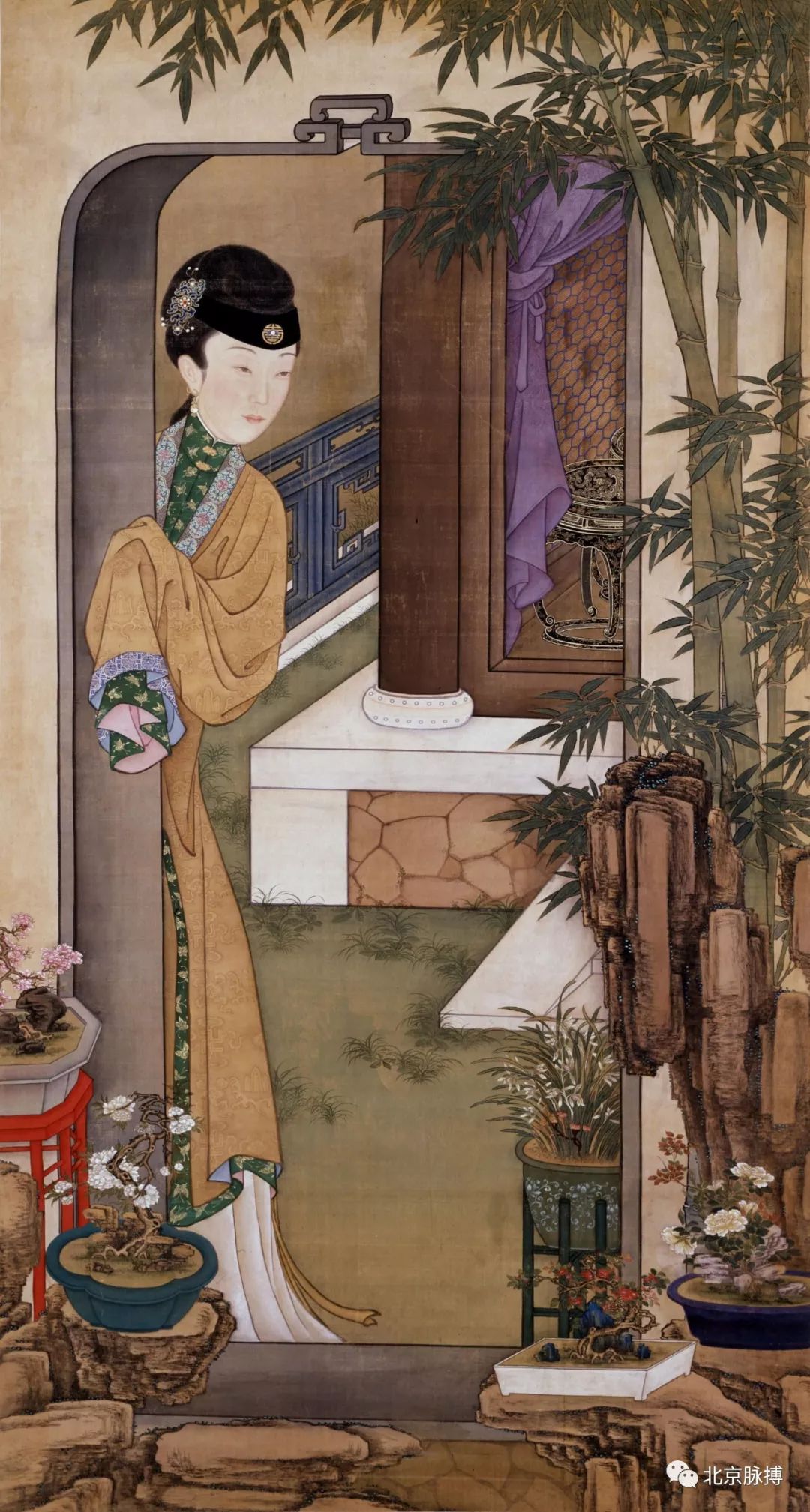 ![]() 庭院中花草竹石满目,并摆放着香兰、月季等各色盆景,争奇斗艳,以婀娜的姿态点缀出俏丽的景致。仕女倚门观望着满园春色,举止间似乎流露着淡淡的叹春情怀。