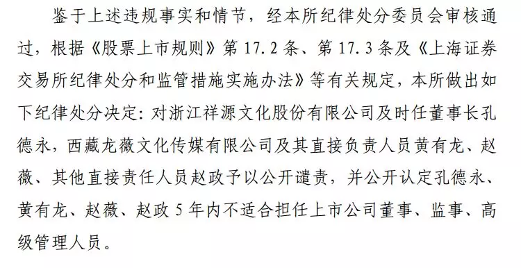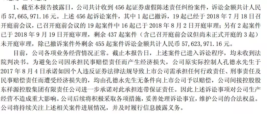 上述456起诉讼案件: 其中1起已撤诉,19起已经于2018年7月18日召开庭前会议,已召开庭前会议的19起案件中16起已于2018年8月2日开庭审理; 另有2起案件已于2018年9月19日开庭审理,剩余437起案件(含已召开庭前会议但尚未正式开庭的3起)未开庭审理 除已撤诉案件外剩余455起案件诉讼金额共计人民币57,623,971.16元。 公司原实际控制人孔德永先生于2017年8月4日承诺如因个人违反证券法律法规导致上市公司需承担任何行政责任、刑事责任及民事赔偿责任而遭受经济损失的,均由孔德永先生无条件向上市公司予以赔偿。 公司间接控股股东祥源控股集团有限责任公司进一步承诺对此承担连带保证责任。 因此上述诉讼事项对公司生产经营不造成重大影响。公司后续将积极采取各项措施,妥善处理诉讼事宜,维护公司的合法权益。公司将持续关注上述相关案件进展情况,并及时履行信息披露义务。 赵薇夫妇遭上交所"封杀"5年内不适合担任上市公司董监高 2018年11月底,祥源文化(原万家文化)发布公告,收到上交所的纪律处分决定书。 决定书上面显示,上交所对祥源文化及时任董事长孔德永,龙薇传媒及其直接负责人员黄有龙、赵薇、其他直接责任人员赵政予以公开谴责。 并公开认定孔德永、黄有龙、赵薇、赵政5年内不适合担任上市公司董事、监事、高级管理人员。