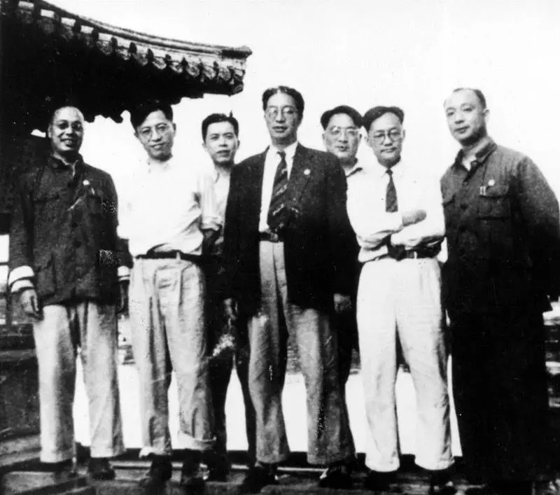 1949年,三十年代在北京熟悉的一批朋友又汇聚在北京北海五龙亭。左起:李健吾、曹禺、(不详)、郑振铎、靳以、巴金、唐弢