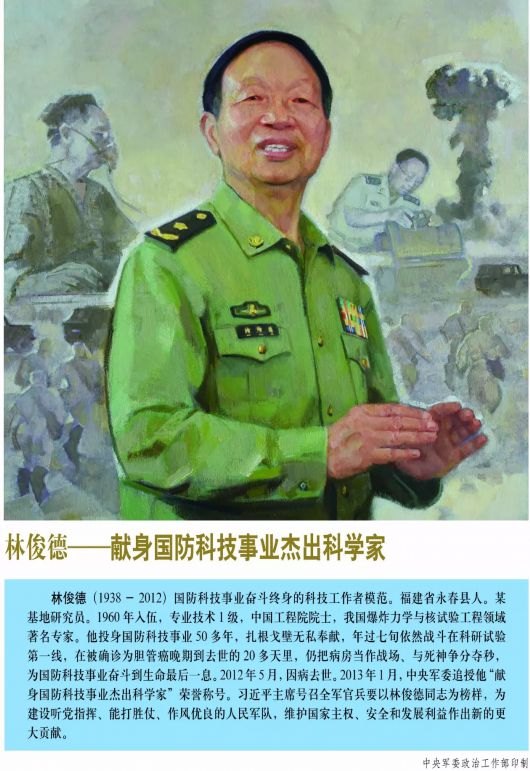一个有希望的民族不能没有英雄 一个有前途的国家不能没有先锋 英模 是一个时代最鲜明的精神座标 尊崇英模是全社会应该凝聚的共识 去年9月,军委批准增加 “献身国防科技事业杰出科学家”林俊德 “逐梦海天的强军先锋”张超 为全军挂像英模