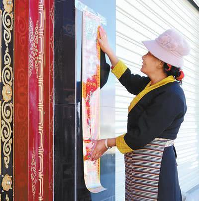 拉萨市城关区慈觉林村,尼玛普赤在贴春联。本报记者 琼达卓嘎摄