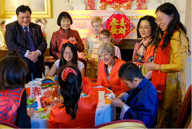 英国首相府还特地请了克劳利学院的学生为来宾来准备当天的中餐 在无数政要到访过的首相府会客厅里,壁炉上挂着中国结,中国生肖猪剪纸摆在英式台灯的旁边。 近百名来自英国各地的60名华裔小朋友制作了中国手工艺品,送给梅和现场来宾。 据英国首相府官方网站消息,梅在招待会上说: 英国是广大华人群体的家园,我们借此新春庆祝活动,赞扬华人华侨在英国社会中的重要作用。 欢迎这么多孩子和年轻的朋友来到唐宁街参加我们的招待会,祝愿大家猪年大吉。 梅还表示,英中关系十分重要,英方重视发展对华关系。 “去年初我成功访华,与习近平主席和李克强总理举行了很好会晤,双方就推进英中关系“黄金时代”达成重要共识。新的一年,英方期待与中方共同努力,推动两国各领域合作取得更多成果。”