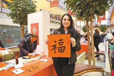 “欢乐春节”走进德国系列活动日前在柏林的波茨坦广场购物中心举行。图为当地民众展示中国书法作品。 本报记者 花 放摄