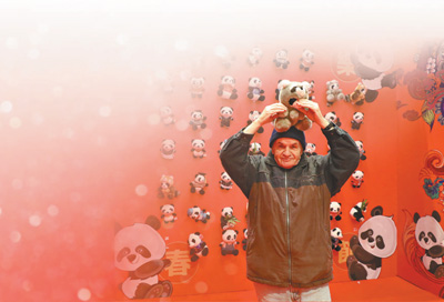 在柏林的波茨坦广场购物中心,一位德国老人在成都旅游文化体验展区开心地向记者展示刚买到的大熊猫毛绒玩具。 本报记者 花 放摄