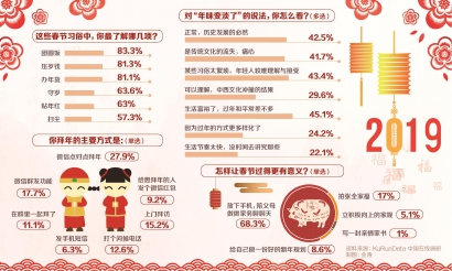 调查说明 春节是中国民间最隆重、最热闹的传统节日。新春贺岁以除旧布新、迎春接福、祈求丰年等活动形式展开,气氛浓郁,内容丰富。 在日新月异的时代,传统春节习俗被赋予新的内涵与展现方式。但有些习俗依旧延续下来,如扫尘、办年货、贴年红、团圆饭、守岁……传统习俗,你知道多少?解放日报社会调查中心联合KuRunData中国在线调研,进行一项有关“农历春节习俗”的调查。 调查采取在线方式,样本总数1000份,按年龄分布:18—24岁、25—34岁、35—44岁、45—54岁、55岁以上各200份。调查数据显示,对于传统的过年习俗,表示“大体知道一点”的最多,占57.6%,“基本知道”的其次,占38%,“完全不了解”的仅4.4%。从年龄分布看,年龄越长,对传统习俗的知晓率越高,反之则低。对于传统习俗的态度,55%的受访者表示“应部分予以肯定并保留”;42.6%的受访者表示“应全部予以肯定并保留”;仅2.4%的受访者“全盘否定”,认为“时代变了,没保留必要”。 团圆饭、办年货、贴年红最有年味 春节习俗有很多,有些耳熟能详,有些似已淡忘。据不完全梳理,调查列出16项传统春节习俗,请受访者勾选心目中最了解的习俗,同时选出最能体现春节团圆、喜庆气氛的习俗。这16项传统春节习俗分别为:扫尘、办年货、贴年红、团圆饭、守岁、压岁钱、拜岁、舞狮、游神、祭祖祈福、(非禁放地区)放爆竹、迎财神、拜年、逛庙会、初一初二不扫地、破五。 数据显示,有6项习俗被超过半数的受访者选为“最了解”,其中,“团圆饭”以83.3%的选择率拔得头筹;其次是“压岁钱”,选择率81.3%;第三位是“办年货”,选择率81.1%;“守岁”选择率63.6%,排第四;第五位是“贴年红”,选择率63%;第六位是“扫尘”,选择率57.3%。而最能体现春节团圆喜庆气氛的习俗,有三项相对集中,“团圆饭”以72.7%的选择率再度拔得头筹;排位第二的是“办年货”,占47.8%;排第三的是“贴年红”,占40.2%。看来,无论时代如何变迁,团团圆圆红红火火过大年,终究是不变的传统。 除夕夜的“团圆饭”在两项选择中均列首位属意料之中。团圆饭又称年夜饭、团年饭。据称,早年团圆饭不但丰富多彩,而且很讲究意头。饭前要先拜神祭祖,席上一般有鸡(寓意有计)、鱼(寓年年有余)、蚝豉(寓好市)、发菜(寓发财)、腐竹(寓富足)、莲藕(寓聪明)、生菜(寓生财)、生蒜(寓会计算)等以求吉利。而今,团圆饭早已不只是一顿饭,而是乡愁、亲情、传统、新潮等的象征。但团圆饭终究还是一顿饭,繁文缛节或许不再,但一桌桌菜里还是包含着人间烟火与市井人情,还有人寿年丰的美好祝愿。年夜饭后,长辈会给晚辈发“压岁钱”,得到压岁钱,晚辈可以平平安安度过一年。 团圆饭哪里吃?虽然近些年“饭店吃”有渐盛趋势,不过调查数据却显示,受访者中85.5%表示“家里吃”,因为“在家里自己动手做然后与家人一起吃,很温馨”;选择“去饭店和家人一起吃的”有13%;另有1.2%的受访者或出于工作等原因,选择“和朋友同事一起吃”。但选择在家吃并不等同于对“饭店吃”就持否定态度,数据显示,受访者对此并不完全排斥,相反,认为“省时且方便”的有34.7%;认为“比家中饭菜新颖精致”的也有30.5%;表示“不很赞成”者仅32.1%;另有2.7%的受访者选择“无所谓”。 团圆饭后,全家人一起守岁。“一夜连双岁,五更分二年”,据说古时守岁有两种含义:年长者守岁为“辞旧岁”,有珍爱光阴的意思;年轻人守岁,则为祈祷延长父母寿命。 家人团聚、走亲访友是“主流” 在春节,你能和家人团聚吗?是否会和老人一起过年?69.2%的受访者表示,一般来说家人都能聚齐,会和家里长辈一起过年;28%的受访者表示大部分时间可以聚齐,没有特别的事基本会选择回家与家人团聚;但也有2.8%的受访者的回答多少有点无奈:家人分散在各处,要聚到一起太不容易,已经好多年没有全家团聚了。 传统的春节从腊八开始,直到正月十五才结束。不过在现代社会中,把春节过得那么长显然不可能,连休7天(含双休日)基本是过年的极限。在有限时间里,你是走亲访友还是出门看山看水、抑或在家看书发呆?在列出的5个选项中,“走亲访友,延续这种最传统的习俗”以74.4%的高占比把其余四项远远抛开,成为春节假期的主要活动;其余四项的选择率分别为:“与同学等聚会”占9%;“看书发呆玩游戏看电影”占8.6%;“和家人一起出去旅游观光”占4.6%;“更喜欢一个人待着,去做些平时没时间做的事”占3.4%。 走亲访友俗称“走亲戚”,指从大年初二开始亲戚朋友间的相互走动。多数受访者显然对这一风俗依然持肯定态度,其中超过半数占55.4%的受访者认同走亲访友是“联络感情的好机会”;有28.6%的受访者表示“没理由,必须的”;其余受访者则对“走亲访友”有自己的想法,有人相对被动,表示“不想走也得走”的有8.8%;有人觉得意义不大,表示是“无效社交”的有3.4%;还有人觉得“给钱包带来不小压力”,占3.8%。 虽然表示走亲访友会给钱包带来压力的受访者不多,但走亲戚时基本都带上礼物。调查中,93.7%的受访者表示“走亲戚”不会空手。至于原因,47.3%的受访者表示:难得回家一趟,带点礼物某种程度是心意的表达;32.2%的受访者表示“没理由,只是遵循沿袭下来的风俗”;19.9%的受访者表示“礼尚往来,再正常不过”;有6位受访者比较有意思,认为捎带礼物是不得已而为之,因为“不带怕被人