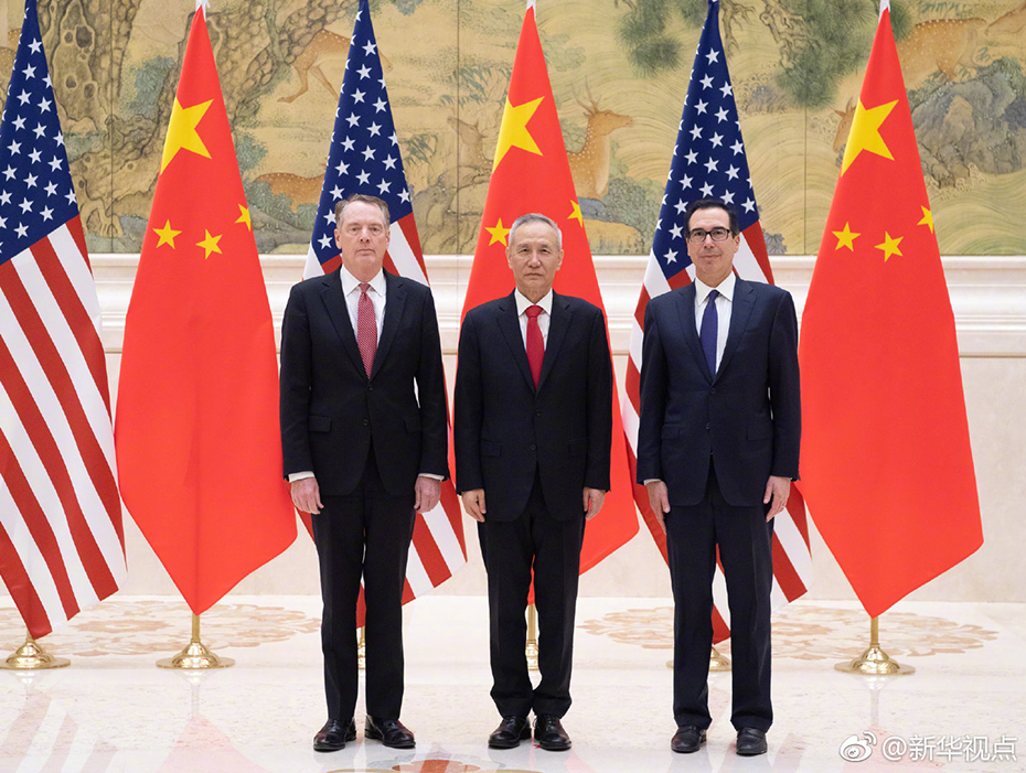 2月14日上午,中共中央政治局委员、国务院副总理、中美全面经济对话中方牵头人刘鹤与美国贸易代表莱特希泽、财政部长姆努钦共同主持中美经贸高级别磋商开幕式。本轮高级别磋商定于14-15日在北京举行。 图片来源:新华视点官方微博