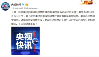 【第七轮中美经贸高级别磋商取得进展 美国延后对华加征关税】美国当地时间2月24日下午,第七轮中美经贸高级别磋商在美国首都华盛顿结束。美国总统特朗普表示,磋商取得实质性进展,美国将延后原定于3月1日对中国产品加征关税的措施。(央视记者王威)