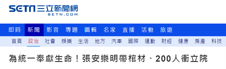 报道截图 据台湾“三立新闻网”报道,关于此次集会,张安乐昨天(25日)就已在脸书发出预告。日前,苏贞昌声称,若两岸开战,“有一个扫把我都拿起来”。台“国防部长”严德发也扬言,台军会战到最后一兵一卒。对此,张安乐在脸书表示,民进党当局把台湾民众当刍狗,一个说要“战到一兵一卒”,一个说要“战到一支扫帚”,但请问民进党官员们的子女又有哪一个在部队,他们不是当民代,就是坐领高薪,或者干脆躲在境外,万一战争爆发,死的都是别人的子女。