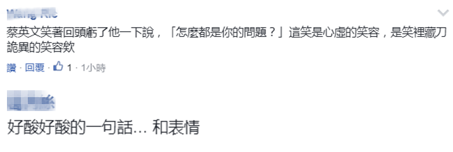 还有网友认为,蔡英文笑里藏刀;话听起来很酸↓
