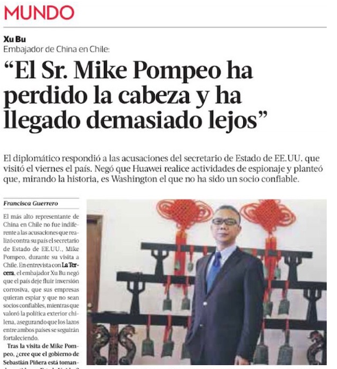智利媒体报道截图(中国驻智利大使馆) 这几天,一向对华口无遮拦的蓬佩奥,受到了中国外交官的连续驳斥。 “蓬佩奥先生可以休矣!”昨天(15日)的外交部例行记者会上,发言人陆慷如此严正劝诫这位美国国务卿。 而再往前一天(14日),一篇题为《蓬佩奥先生完全错了》的署名文章在智利第一大报《信使报》刊出。 同一天,智利主流媒体《三点钟报》纸版和网络版则同步刊登对徐大使专访,访谈中,徐大使直言:蓬佩奥已经“失去理智”。 从“可以休矣”到“失去理智”,中国外交官们的连番表态,语气不可谓不重。 但究其原因,让中国短时间内作出如此密集而严厉反击的,正是蓬佩奥这些天的所作所为——近日,他在访问拉美国家期间频频拿中国说事儿,极尽挑拨之能事。 “蓬佩奥先生已经失去理智,他走得太远了” 美国国务卿蓬佩奥此番对华“发难”,是从12日开始的。 当天,蓬佩奥对智利、巴拉圭、秘鲁和哥伦比亚四国开始展开访问。有分析人士认为,蓬佩奥此行主要目的就是与盟友就委内瑞拉问题协调立场。 说是“协调”,但美国国务卿言辞中满是威逼利诱,尤其热衷在这些国家散布所谓“中国威胁”。 比如在首站智利,蓬佩奥便在中智贸易问题上指手画脚,甚至妄称“中国杀害了数百名美国人”。 而在访问秘鲁时,他还对当地媒体表示,拉美国家要“警惕中国技术”。