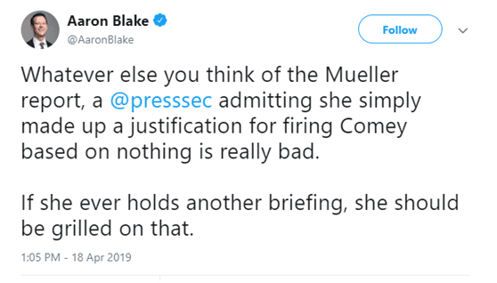 《华盛顿邮报》记者Aaron Blake也说:“如果她(桑德斯)再主持一次新闻发布会,她应该受到严厉质问。”⬇️