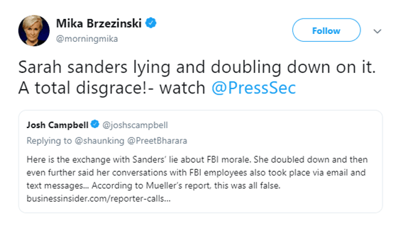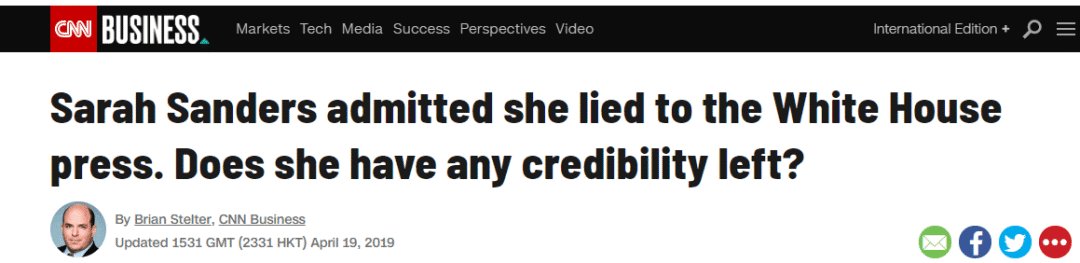 CNN报道截图 报告称,在桑德斯还是副新闻秘书时,就曾编造许多事实。桑德斯曾两次表示“无数”FBI工作人员告诉她,他们感激特朗普解雇了联邦调查局局长科米。但在与穆勒交谈时,桑德斯却称这一表述“只是口误”。此外,桑德斯还曾在一次媒体采访中表示,“FBI普通员工对科米失去信心”,但后来也证实该说法“没有任何依据”。 CNN说,在穆勒的报告公布后,随着桑德斯的声誉受到严重损害,不少人站出来表达对桑德斯的不满,甚至还有一位白宫记者要求解雇桑德斯。 MSNBC记者Mika Brzezinski在推特上写道:“萨拉•桑德斯在撒谎,并且愈发严重。这太丢人了!”⬇️