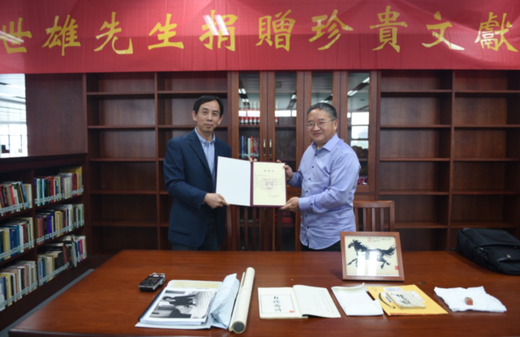 2019年4月22日上午,“杨世雄先生捐赠珍贵文献仪式”在南京大学杜厦图书馆五楼艺术与名人捐赠阅览区举行,胡小石先生的外孙杨世雄、谭雨孙与重外孙杨大宁,胡小石故居现主人吴懋楠,南京大学图书馆、文学院负责人以及文学院部分师生等参加仪式。图书馆副馆长史梅主持捐赠仪式。![]() 文学院党委书记刘重喜介绍了与杨世雄先生的结缘以及这批文献的捐赠缘起。据介绍,胡小石先生和南京大学有着深厚的渊源,作为南京大学文学院先贤之一,文学院师生对胡先生的书法、学术历来均有多方面持续的研究,也推出了一系列相关学术讲座和活动。2018年底胡小石和他的时代展览筹备之际,杨世雄先生为展览提供了大量珍贵照片,还包括四幅胡小石先生抗日战争时期的作品,很好地补充丰富了此次展览的内容。之后,杨先生决定将自己珍藏的相关文献无偿捐赠给南京大学。 杨世雄展示了此次所捐赠的十件珍贵文献,其中有胡翔冬先生手书的诗轴一幅、胡翔冬先生诗集初印本《自怡斋诗》(内有吴白匋先生题赠)一册、陈散原先生诗轴(胡小石先生题卷)一卷及胡小石先生所用印章一枚等,均具有较高的史料价值和学术研究价值。他在谈及这些文献背后的故事时指出,这些文献同时也是时代的见证者。 南京大学图书馆馆长程章灿代表图书馆接受捐赠,为杨世雄先生颁发感谢函并致辞。他结合自己的学术和工作经历从学源关系角度谈及与胡小石先生的关系,从书法史、学术史及南京大学校史三个方面肯定了胡小石先生书法及其后人所捐赠文献的重要意义,并指出杨先生此次捐献的文献对南京大学文学院一脉相承下来的所有学人乃至对整个20世纪中国文化、中国学术和艺术的研究者都有重要意义。程章灿表示图书馆会很好地收藏这批文献,并承诺在保护、存藏的基础上,更好地做好传播和开发工作,使其充分发挥学术价值、文化价值。 ![]() 捐赠现场 文学院院长徐兴无指出,胡小石先生不仅是一位书法家,还是一位诗人、著名学者,他一生给我们留下了许多宝贵的文化财富。胡先生在生前就已把自己的珍藏,作为公器而非私藏慷慨捐献,这是一种深厚的文化情怀。南京大学图书馆镇馆之宝之一《鹦鹉洲》,正是来自胡小石先生的捐赠。杨世雄先生及家族也正是继承了这样的家风,令人感佩。感激之余,徐兴无表示,南京大学将不负期望,认真做好这批文献的收藏、整理研究工作,并将之发扬光大,惠及学林。 捐赠仪式结束后,与会嘉宾共同参观了胡小石先生此前捐赠的大量珍贵文献。 (责任编辑:晓歌) |