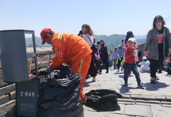 本文图片均来自北京头条客户端 五一小长假第一天,八达岭长城迎来5.4万余游客“打卡”,而著名的网红景点好汉坡成为游客最为集中的区域。北青报记者从八达岭特区办事处获悉,为了更好地服务游客,八达岭长城景区采取从周边借用停车场、增加志愿者以及免费客运大巴接驳等措施,让游客进得来出得去,更好地体验长城之美。 现场丨那张长城人山人海的照片是在“好汉坡” 每逢节假日期间,网上会流传出八达岭长城景区内摩肩接踵的场景,这一地点为众多游客的必去之地——好汉坡。5月1日上午,北青报记者专门来到八达岭长城的好汉坡,这里距离缆车的上下站点比较近,刚从缆车上下来的游客全部会往好汉坡上走,由于地势陡峭,从下往上看去,会看到人头攒动的场景。 “经常看到网上的小视频,说是八达岭长城人山人海,专门来这里看一下。”来自城区的市民杨先生说,他对长城并不陌生,但是假日期间还是带着家人一起来了,“八达岭长城比较雄伟,值得来看。” 记者注意到,由于游客较多,好汉坡景区每隔几十米远就能见到一名志愿者或者武警战士,为游客指路或者进行客流疏导。 对此,景区工作人员也表示,希望游客合理选择攀登路线,没必要过于集中在好汉坡等某一处景点。 提醒丨你随手扔的垃圾都是环卫工人背下山的 由于长城沿着山脊而建,平地并不多,爬累了的游客会集中到敌楼附近休息,记者看到有部分游客会将手中的矿泉水瓶以及火腿肠包装、卫生纸等随意丢弃,风力较大时会四处飘散,环卫人员看到后不得不到处捡拾。 “这些游客丢弃的垃圾,我们都要全部背下山去。”一名正在忙碌的环卫工说,游客的文明程度已经越来越高,希望大家都将垃圾放置到垃圾箱里,工作人员会及时收纳。