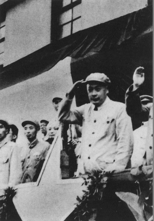 1949年7月6日下午,上海举行百万军民联合游行。图为陈毅在主席台上检阅游行队伍。