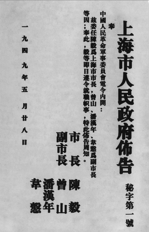 看到部队的报告,总前委感觉到城市接管确实是很复杂的问题。由于战线推进太快,许多准备工作来不及或不细致。4 月30日,总前委报告军委,要求推迟进占上海。电报说:“就军事上说,杭州、上海很快即可拿下;就政治上说,我们许多重要准备都未作好……我们考虑,以尽可能推迟半月到一月入上海为好。”5月3日,毛泽东批准了总前委的请求。 5 月初,小小的丹阳县城突然热闹起来。陈毅、饶漱石于3日到达这里,主持解放上海的准备工作。数千名干部从各解放区、北平、香港日夜兼程赶来,投入接管上海的集中整训。他们当中有许多人是著名的“上海通”,如上海地下党负责人刘晓、从事文化工作的夏衍、从事秘密工作的潘汉年,从事经济工作的许涤新。各路精英汇集一堂,分头进行调查研究和准备工作。有关上海的政治、经济、社会、文化等多方面的资料,有从敌人那里缴获的、有上海地下党调查的、有上海来人报告的,整理成 200 多本小册子。大家根据这些材料和中共中央的有关政策,研究接管上海的具体方针措施。如上海的官僚资产阶级和民族资产阶级如何区别对待,外国人的企业如何接管,国民党政府机构如何处理,金融如何稳定,流氓帮会怎么办,市民的粮、煤等生活必需品如何保证供应等等。 ![]()