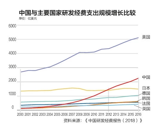 ![]() 而从2017年开始,中国已经成为全球第二大研发国家,仅次于美国,全社会研发经费投入达到1.7万亿。然而,无论是“十五”“十一五”还是“十二五”期间,科技发展规划研发经费投入强度的目标均没有实现,但和目标的差距在逐步缩小。 中国研发经费调研:1.7万亿去向何方 4月17日,教育部发布通知,要求高校科研人员不得弄虚作假,骗取科技项目、科研经费以及奖励、荣誉等,并且要求在赋予科研管理更大自主权过程中,把科研人员从报表、报销等具体事务中解脱出来。 近年来,中国的科研管理一直在不断完善,但仍存在一些体制机制障碍亟待理清。其中,对科研经费的不当使用,也时见报端。 2019年的《政府工作报告》指出,要开展项目经费使用“包干制”改革试点,不设科目比例限制,由科研团队自主决定使用。以经费为抓手,进一步给科研“松绑”。 事实上,在科研投入上,中国的问题主要不是缺钱,而是这些钱从哪儿来,又去向何方。 近日,以大连理工大学经济管理学院为主的研究团队发布了《中国研发经费报告(2018)》,首次全面梳理、解读和分析了中国2000-2016年的研发经费情况。 而从2017年开始,中国已经成为全球第二大研发国家,仅次于美国,全社会研发经费投入达到1.7万亿。然而,无论是“十五”“十一五”还是“十二五”期间,科技发展规划研发经费投入强度的目标均没有实现,但和目标的差距在逐步缩小。 报告的项目负责人、大连理工大学经济管理学院教授孙玉涛对《中国新闻周刊》表示,当前中国科技创新的主要挑战并不是研发经费投入规模,而是如何优化研发经费投入结构,提升研发经费使用效率。 中国已经迈入创新型国家的门槛 从数据上看,自2006年《国家中长期科学和技术发展规划纲要(2006-2020 年)》中提出“自主创新”战略和“建设创新型国家”的目标以来,中国的研发经费逐年上涨,年平均增长率达到了19.59%。除了美国可以和中国并行,在法国、德国、日本、英国和韩国等众多接近水平的曲线中,中国的增长曲线则一路向上。 在研发规模的绝对值上,2006年以来,中国的研发经费支出相继超过了韩国、英国、法国、德国和日本,成为全球第二。 更有代表性的指标是“研发经费投入强度”(简称“研发强度”),即全社会研发经费占国内生产总值(GDP)的比重。该数值表示一个国家愿意把多少资源用于研发活动,反映了整个国家和社会对科技的重视程度。 报告显示,中国的研发强度在2000年还不足1%,2016年已经增至2.11%,已超过欧盟15国平均水平2.09%,但与经济合作与发展组织成员国平均水平2.34%还有一定差距。美国的研发强度在2000-2016年一直稳定在2.5%以上。 2.5%也是中国研发强度2020年要达到的目标。 中国科学技术信息研究所政策与战略研究中心主任程如烟曾撰文指出,中国要在2020年实现2.5%的研发强度,有相当大的难度,要追上美国2016年2.74%的研发强度则需要相当长的时间。 她指出,随着中国经济进入新常态,中国的研发强度将改变以往迅猛提高的走势,转变为缓慢上升的趋势。 增速下降,不意味着预期悲观。 孙玉涛指出,有些国家很早就达到并稳定在较高的投入强度,不会一直增长,以美国为例,很早就达到了2.5%~2.8%。中国的主要任务,是把研发投入强度继续维持在2%以上。“研发强度2%是进入创新型国家门槛值。”他说。 报告指出,自2013年以来,中国已经连续4年研发经费投入强度突破2%,达到中等发达国家水平,“一脚已经跨进了创新型国家的门槛”。 政府研发经费投入占比逐年下降 虽然中国的研发强度在逐年增加,但无论是“十五”“十一五”还是“十二五”期间,都没有实现既定目标。 根据报告,2005年1.3%的研发强度离“十五”的目标1.5%还差0.2个百分点。“十一五”期间达到1.71%,距离2%的目标仍低了0.29个百分点。“十二五”阶段实现了2.06%的强度,没有完成2.2%的目标任务,但差距缩小到0.14个百分点。 ![]() 原科技部部长万钢指出,研发强度是衡量经济发展方式转变和创新驱动的重要指标,“十二五”期间没有达到2.2%的目标表明中国整体科技投入和经济发展规模不匹配。因此,要想到2020年实现“十三五”2.5%的目标,需要增强社会各方面的投入。 孙玉涛认为,研发强度没有实现既定目标,与中央政府投入经费的占比逐年下降有关。 报告指出,从经费来源的角度看,1995~2016年,中国研发经费部门来源结构从政府和企业双主体转变成了企业单主体。 在绝对数上,企业来源研发经费从300亿增长到约1.2万亿,增长了40倍;而政府来源研发经费从约250亿增长到近3200亿,只增长了12.8倍。企业经费的增长速度远超过政府经费。与此同时,企业来源经费比例从约30%增长到了70%,而政府来源经费比例从25%下降到了20%左右。 早在2005年,在发布《国家中长期科学和技术发展规划纲要(2006-2020年)》之前,负责制定纲要的战略研究专题组组长、时任财政部财政科学研究所所长贾康就指出,结合国外经验,在工业化进程中,全社会经费中政府资金所占比例一般在30%~50%,企业占40%~60%。 数据显示,当研发强度达到2%时,美国的政府来源经费占比为62.8%,法国为53.9%,英国和德国分别为48.1%和41.8%,日本在1981年迈入2%的门槛,当年的政府经费占比也达到了27%。 孙玉涛表示,他曾经研究过,当欧美各国研发投入强度为2%的时候,政府投入的比例很高。“从中国的经济发展阶段来看,政府投入比例