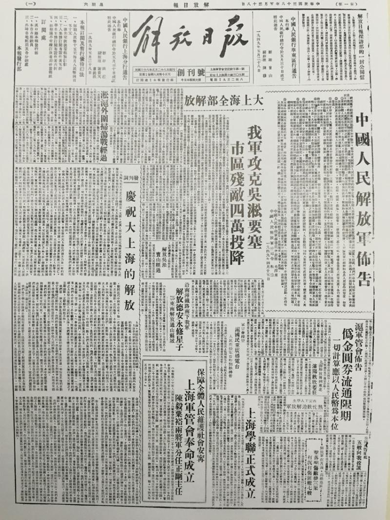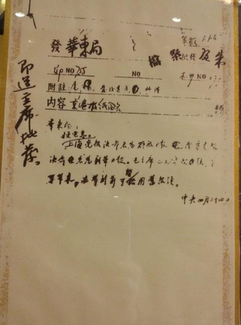 1949年4月24日,中共中央给华东局关于上海、南京党报命名的批复。