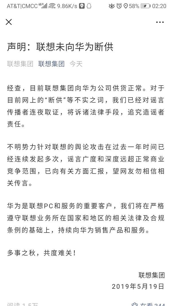 经查,目前联想集团向华为公司供货正常。对于目前网上的“断供”等不实之词,我们已经对谣言传播者连夜取证,将诉诸法律手段,追究造谣者责任。 不明势力针对联想的舆论攻击在过去一年时间已经连续发起多次,谣言广度和深度远超正常商业竞争范围,已向有关方面汇报,望网友勿相信相关传言。 华为是联想PC和服务的重要客户,我们将在严格遵守联想业务所在国家和地区的相关法律及合规条例的基础上,持续向华为销售产品和服务。 多事之秋,共度难关! 联想集团