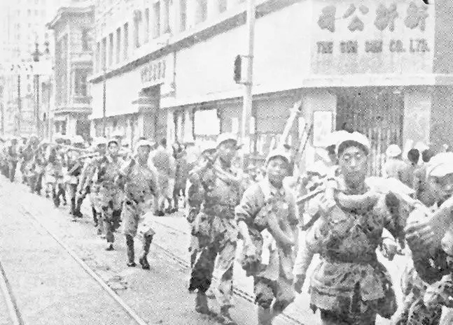 永安公司的一间暗室里,公司地下党组织正召集共产党员和部分积极分子开会,布置迎接上海解放的具体任务。会后,大家迅速就位,有的巡查商场各个楼面和主要入口,严防特务破坏,有的在大幅白布上抄写《中国人民解放军布告》,还有的在油印宣传品…… 25日凌晨2点左右,在永安公司屋顶值勤的人民保安队员先发现一队军车由远而近地驶来,车上正是日夜盼望的中国人民解放军。人民保安队员兴奋极了,不禁高声欢呼:“解放军来了!” 这一消息如同春雷响起,顿时在职工中传开了,大家纷纷拥到大楼窗口争睹解放军风采。作为先遣队,身穿黄色军装的解放军战士们整齐地行进在南京路的人行道上。不一会儿,对面先施公司和新新公司门前的人行道上,战士们静静地席地而坐。 “解放了!上海解放了!”永安公司职工抑制不住喜悦的心情,欢呼起来。这时,地下党永安公司党支部提议以升红旗的形式欢迎解放军的到来和上海的解放,大伙齐声称好。说干就干,有人马上来到公司棉布柜台,抽出一匹红布,剪了一段,来到缝纫间,请金永铭师傅赶制出一面鲜艳的红旗。 ![]()